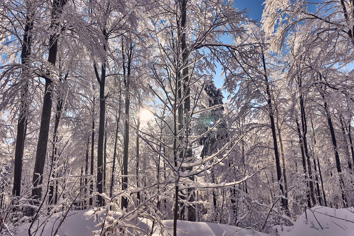 Verschneiter Winterwald, gemütliche Einkehr, schöne Aussichten. Eine Genuss Wanderung, die Erholung pur bietet.